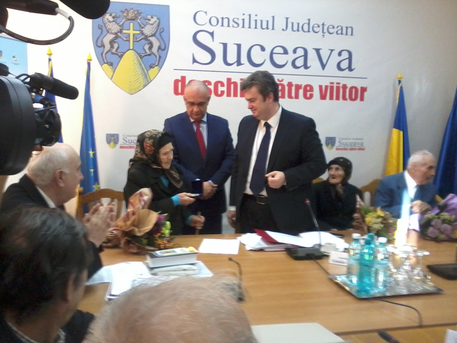 3 persoane din judeţul Suceava (două femei şi un barbat), născute în anul 1918, au primit astăzi, din partea preşedintelui Consiliului Judeţean, Cătălin Nechifor, medalia comemorativă.