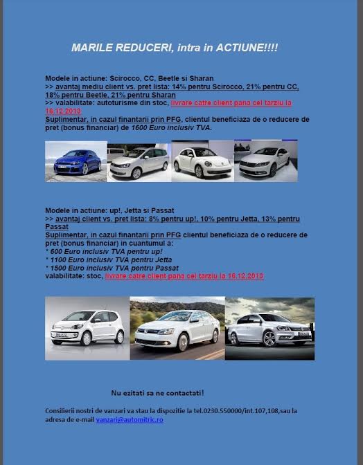 >> avantaj client vs. preţ listă: 8% pentru up!, 10% pentru Jetta, 13% pentru Passat