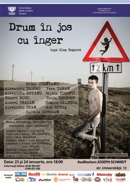 Sala Auditorium “Joseph Schmidt” va găzdui, în zilele de 23 şi 24 ianuarie, o reprezentaţie a teatrului studenţesc “FabulinUS”, al Universităţii “Ştefan cel Mare” Suceava, cu premiera piesei “Drum în jos cu înger”, după Oleg Bogaiev.