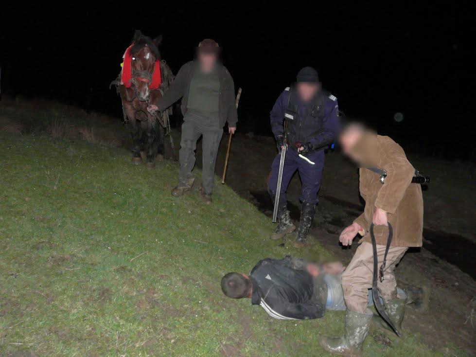 Jandarmii au constatat că la faţa locului se aflau şapte arbori din specia molid, tăiaţi, instrumente folosite la tăierea sau transportarea butucilor (topor, hamuri, ştreanguri, orcic, cârlige şi lanţuri), precum şi doi cai, folosiţi pentru transportul lemnului.