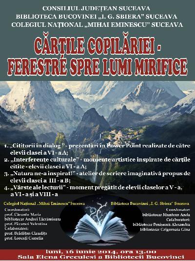 Biblioteca Bucovinei “I.G. Sbiera” şi Colegiul Naţional “Mihai Eminescu” Suceava organizează luni, 16 iunie, la ora 13.00, în Sala de Artă “Elena Greculesi” a Bibliotecii Judeţene, manifestarea “Cărţile copilăriei – Ferestre spre lumi mirifice”.