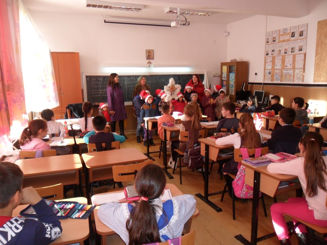 “14 copii de la grupele mari ale grădiniței au venit plini de voie bună să ne colinde. Și nu s-au încurcat în vorbe! I-au întâmpinat domnul director Deleanu Liviu, doamna profesoară Anechiforesei Lăcrămioara (coordonator al proiectului), elevii clasei a IV-a B și doamna prof. pentru înv. primar Lupu Maria (membru al proiectului). Activitatea “Datini din străbuni” a fost realizată de doamnele profesoare Sandu Mihaela (coordonator al proiectului), Scutaru Viorica și Răileanu Monica. Copiii au fost răsplătiți cu bomboane, portocale, cărți de colorat și creioane colorate. Le mulțumim din suflet pentru colinde și urări, pentru bucuria și spiritul Crăciunului pe care ni le-au împărtășit!”