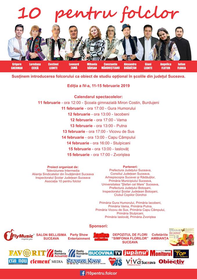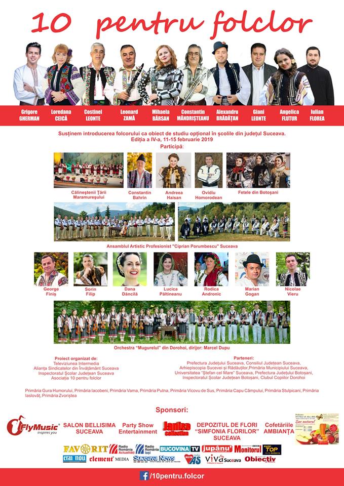 Proiectul „10 pentru folclor” presupune 10 întâlniri-spectacol în fiecare an, susţinute gratuit de artişti îndrăgiţi, cu scopul de a promova introducerea folclorului ca obiect de studiu opţional în şcolile din judeţul Suceava, şi va începe pe 11 februarie, la Şcoala ”Miron Costin” din Suceava.