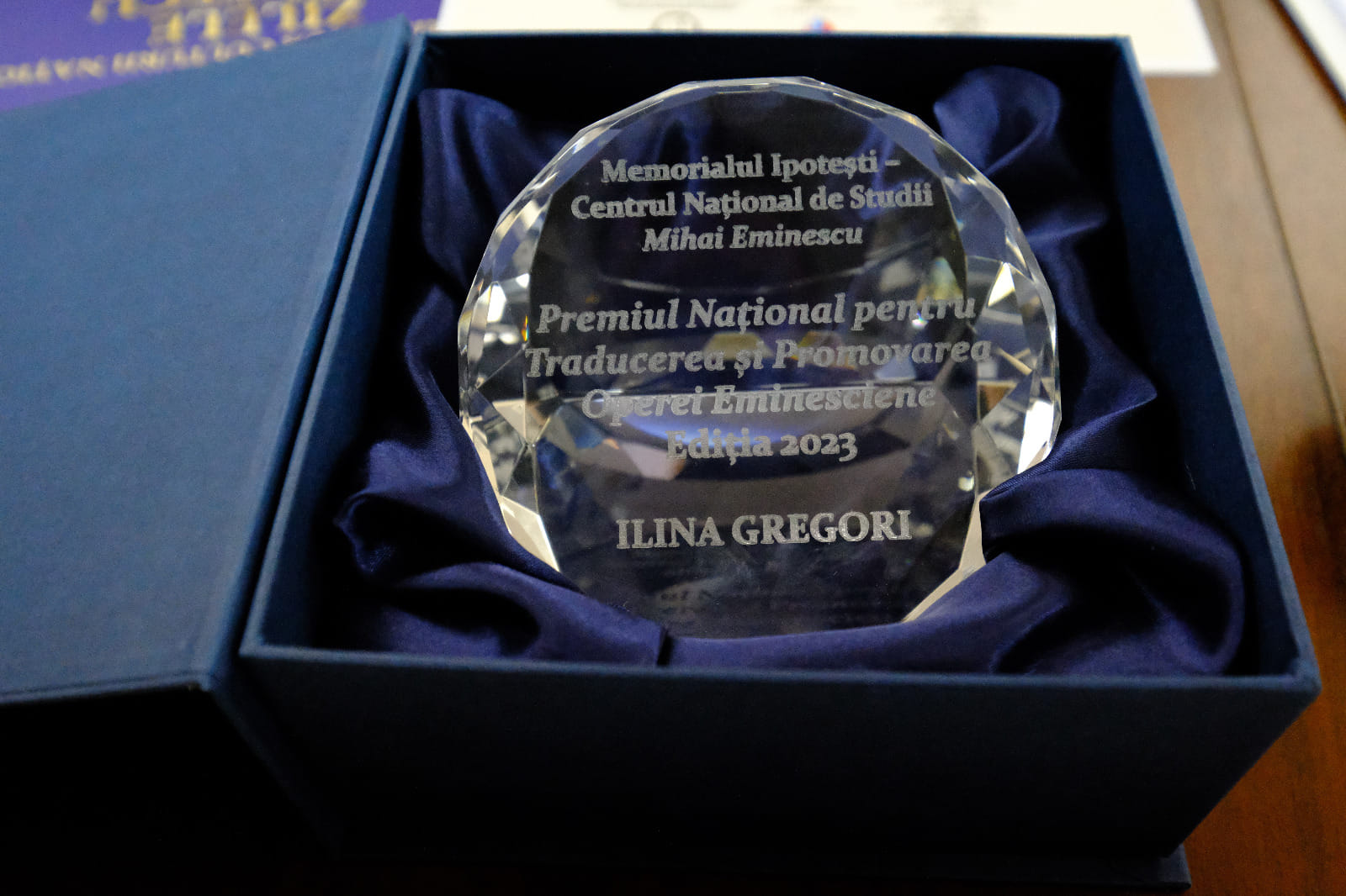 Juriul s-a declarat onorat să acorde Premiului Național pentru Traducerea și Promovarea Operei Eminesciene (ediția 2023) doamnei Ilina Gregori, „ambasador al culturii române și al Memorialului Ipotești – Centrul de Studii „Mihai Eminescu” în Germania”.