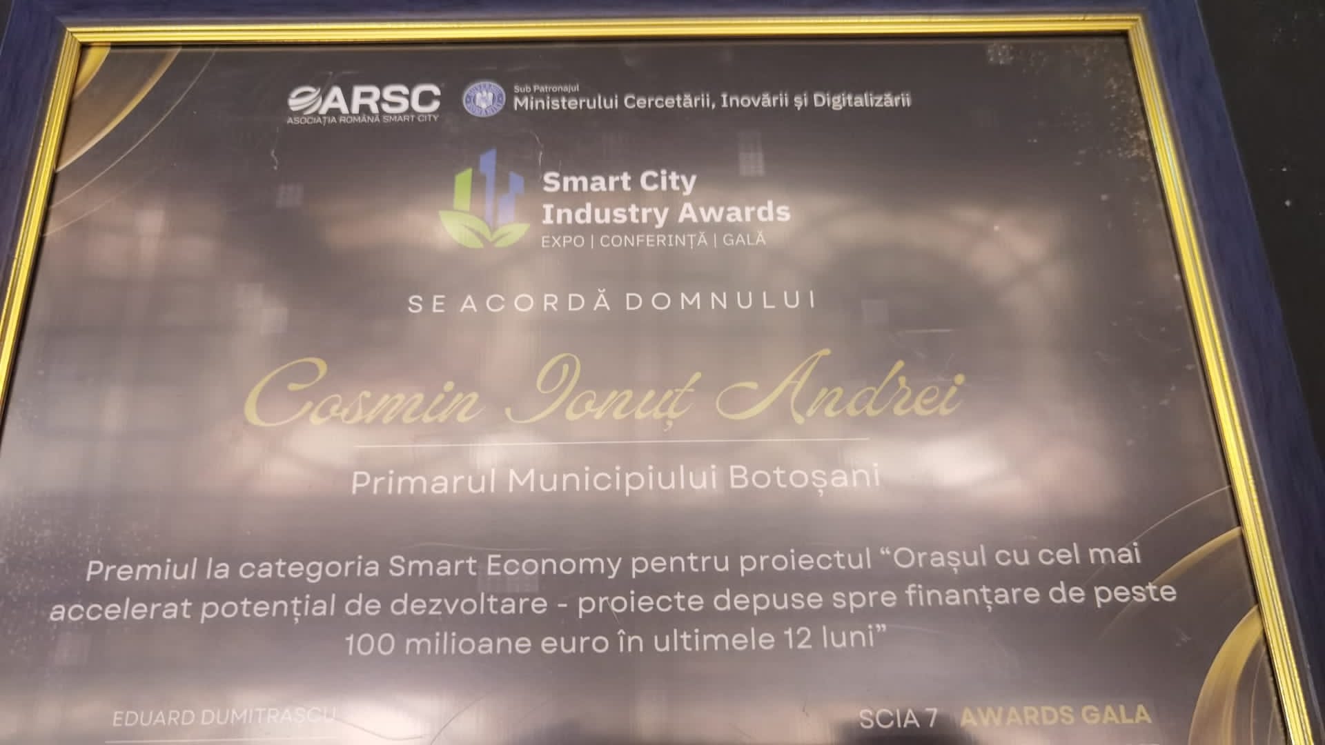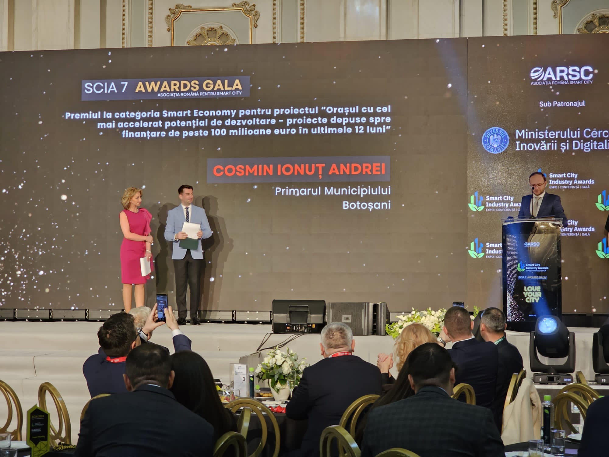 Primarul municipiului Botoșani, Cosmin Andrei, însoțit de șeful Serviciului Management Proiecte, Raluca Bălășcău și viceprimarul Bogdan Buhăianu, a participat în această săptămână la Gala celei de-a 7-a ediții a SMART CITY INDUSTRY AWARDS, cadru în care a primit premiul la categoria SMART ECONOMY pentru proiectul „Orașul cu cel mai accelerat potențial de dezvoltare – proiecte depuse spre finanțare de peste 100 milioane de euro în ultimele 12 luni”.
