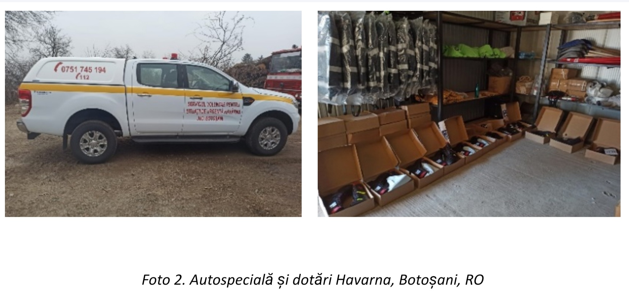 În cadrul proiectului au fost dotate serviciile voluntare pentru situații de urgență din cadrul comunelor implicate în proiect cu echipamente de intervenție necesare în caz de urgență. Este vorba de autospeciale de intervenție, echipamente de salvare, echipamente de protecție pentru pompieri.