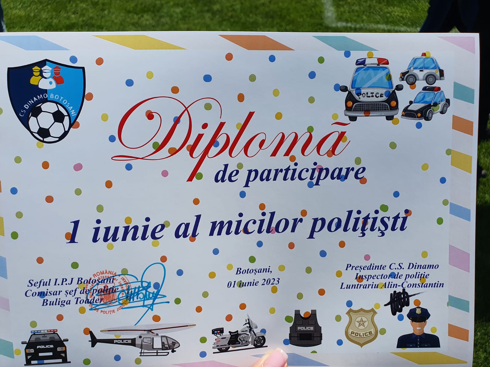 La finalul activităților, cei mici au primit diplome de “Mici polițiști” și surprize dulci oferite cu sprijinul Asociației Dinamo.