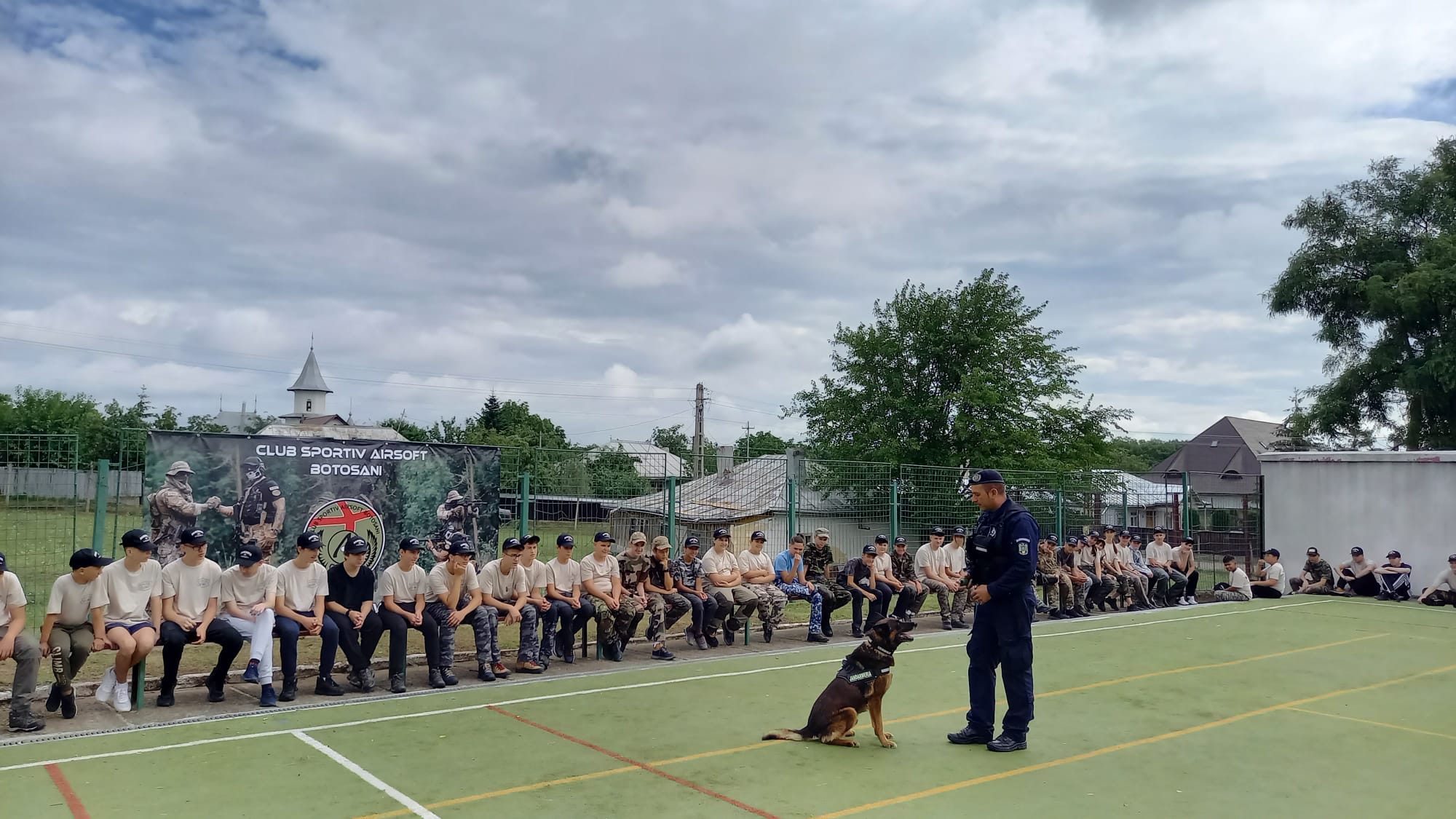 După servirea mic-dejunului, activitățile au continuat cu un program de instrucție prezentat de un tânăr ofițer jandarm, absolvent în acest an al Academiei de Poliție ,,A.I.Cuza” București și repartizat recent la Jandarmeria Botoșani, elemente de dresaj canin cu câinele de serviciu Pih și recomandări pentru gestionarea atacului unui câine agresiv.