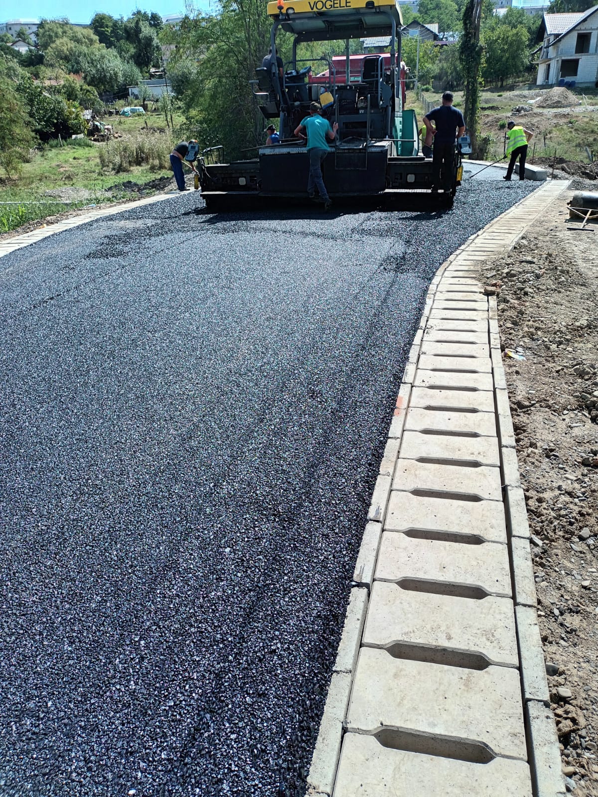 După ce au executat lucrări la rigole și au amenajat stratul de binder, constructorii au intervenit astăzi și la stratul de uzură, pe toată lungimea drumului de 360 m.