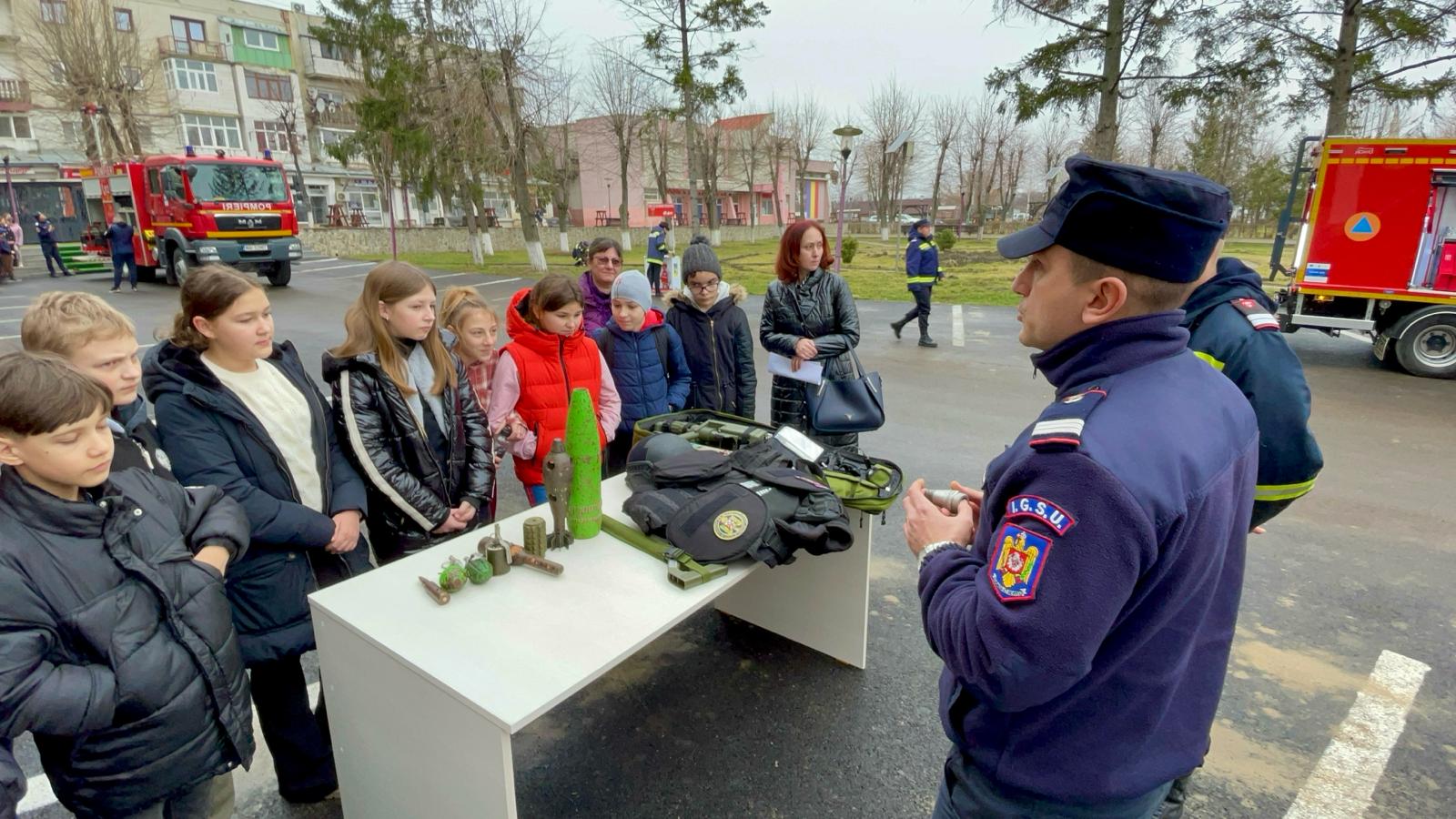 Pirotehnicienii le-au prezentat cele mai frecvente elemente de muniție, rămase neexplodate din timpul celor două conflicte armate, care sunt descoperite pe raza județului Botoșani, autospeciala pirotehnică, aparatura și echipamentele cu care intervin în astfel de situații. Totodată, le-au vorbit despre cum trebuie să se comporte în cazul în care descoperă muniție neexplodată.