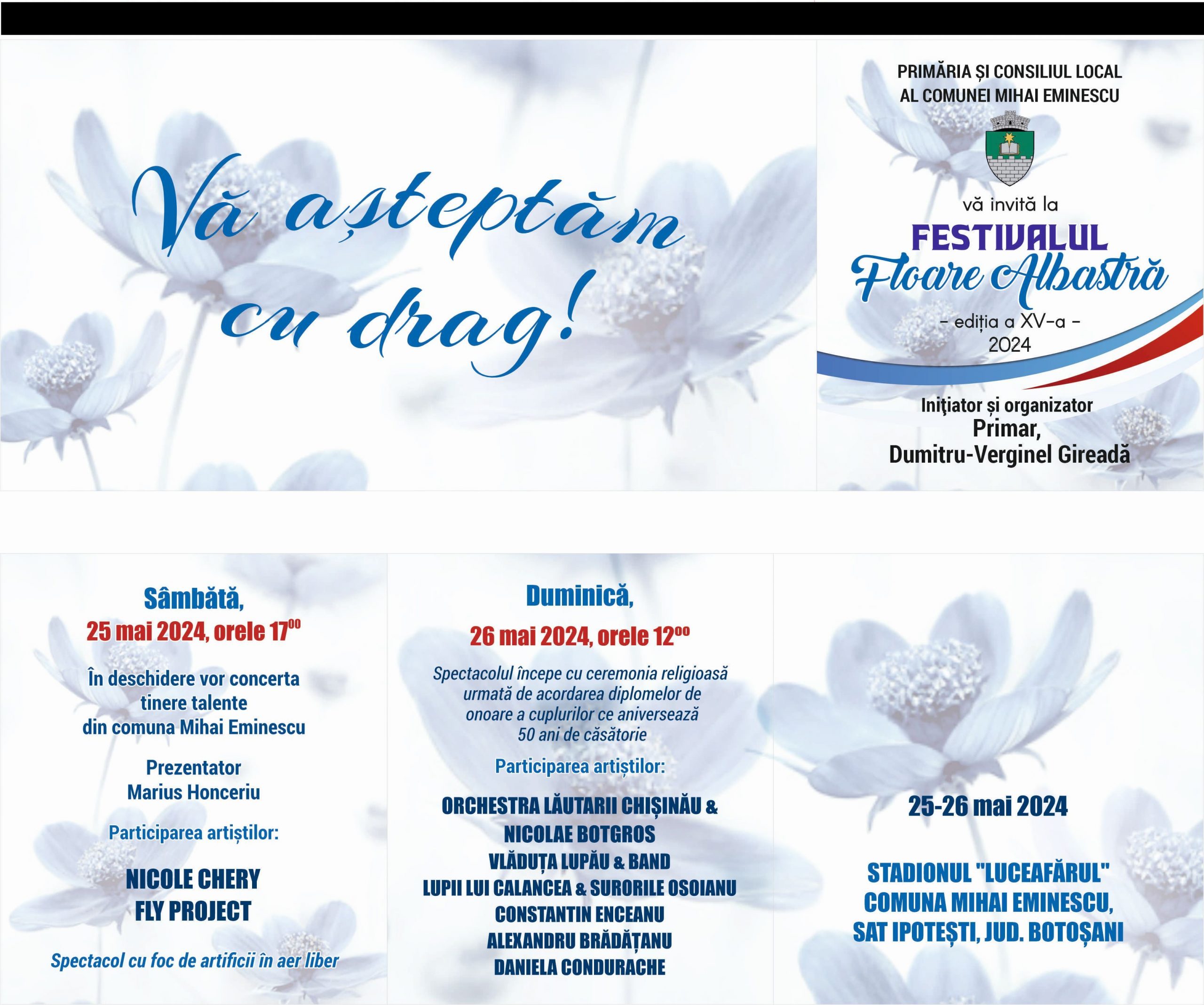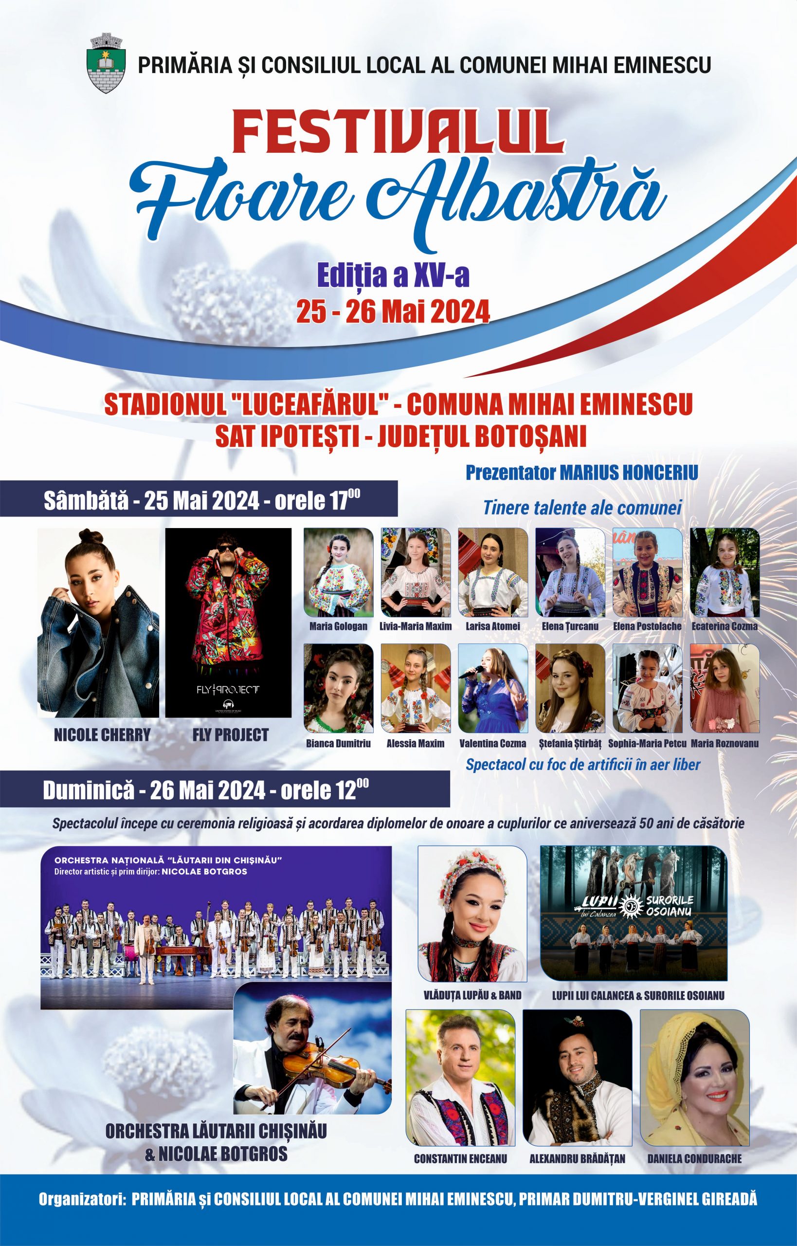 Primăria și Consiliul Local al comunei Mihai Eminescu organizează în zilele de 25 și 26 mai 2024 cea de-a XV – a ediție a Festivalului Floare Albastră.