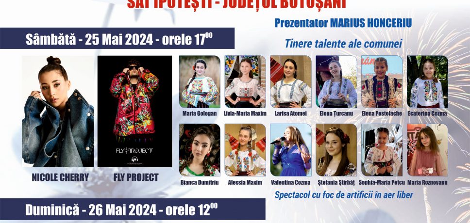 În acest an, în seara de sâmbătă, 25 mai 2024, începând cu ora 17:00, pe scena festivalului vor desfășura câte un moment artistic tinerele talente din comuna Mihai Eminescu, după care ne vor încânta NICOLE CHERRY ȘI FLY PROJECT.