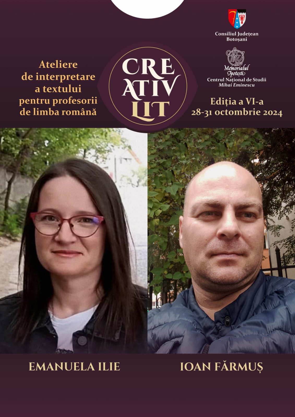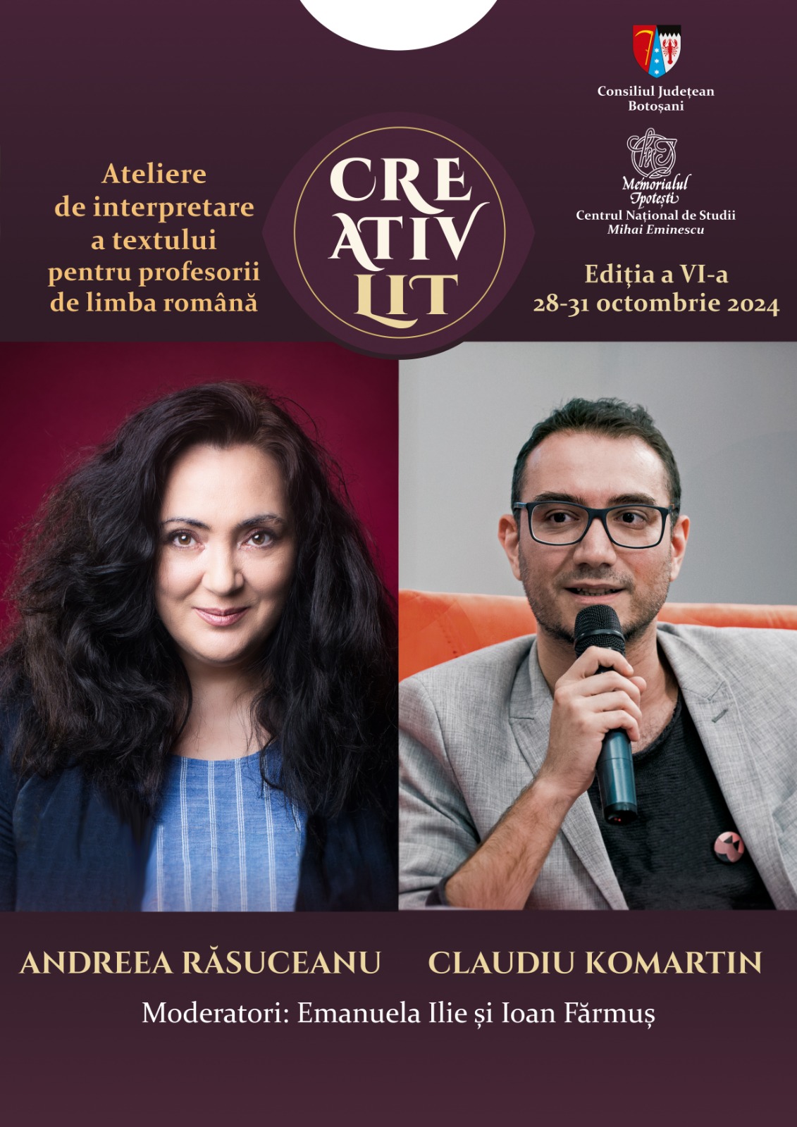 Memorialul Ipotești – Centrul Național de Studii „Mihai Eminescu”, instituție din subordinea Consiliului Județean Botoșani, organizează, în perioada 28-31 octombrie 2024, a VI-a ediție a Atelierelor de interpretare a textului CreativLit.