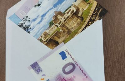 Bancnotă suvenir de zero euro, la Cetatea Sucevei